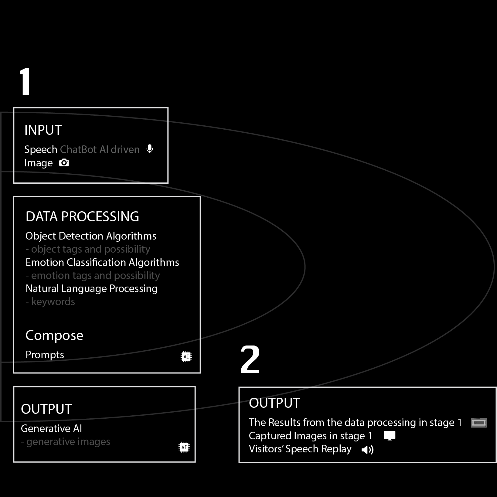 Yet, lurking beneath this congenial interaction are darker processes - obscured data surveillance, emotional manipulation, and concealed facial recognition - that run counter to the dialogue. Will participants complete the portrait or discern these underlying mechanisms? As they weave their narratives, drawing from the depth of their interactions, the ultimate revelation hinges on their unique journeys. As co-architects of AI, we are confronted with the question: how close do we come to our digital progeny?